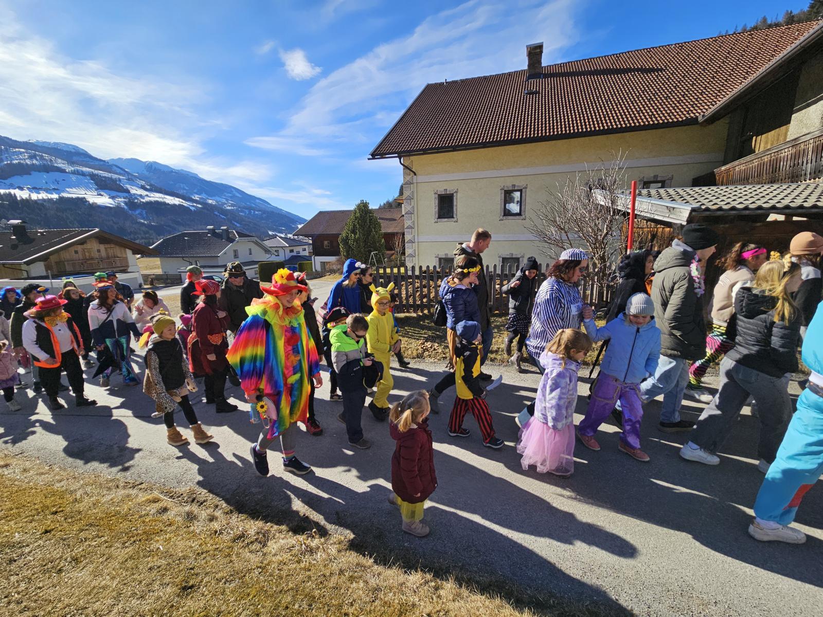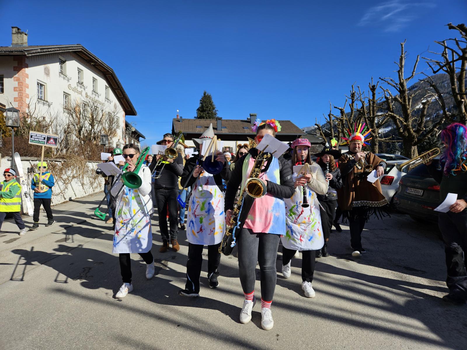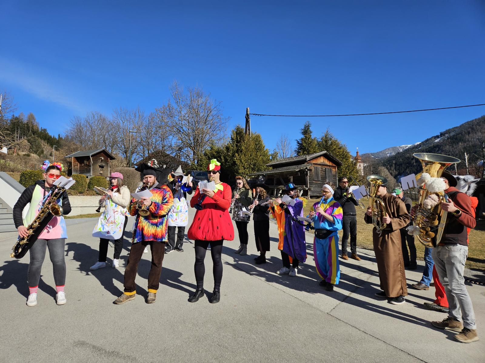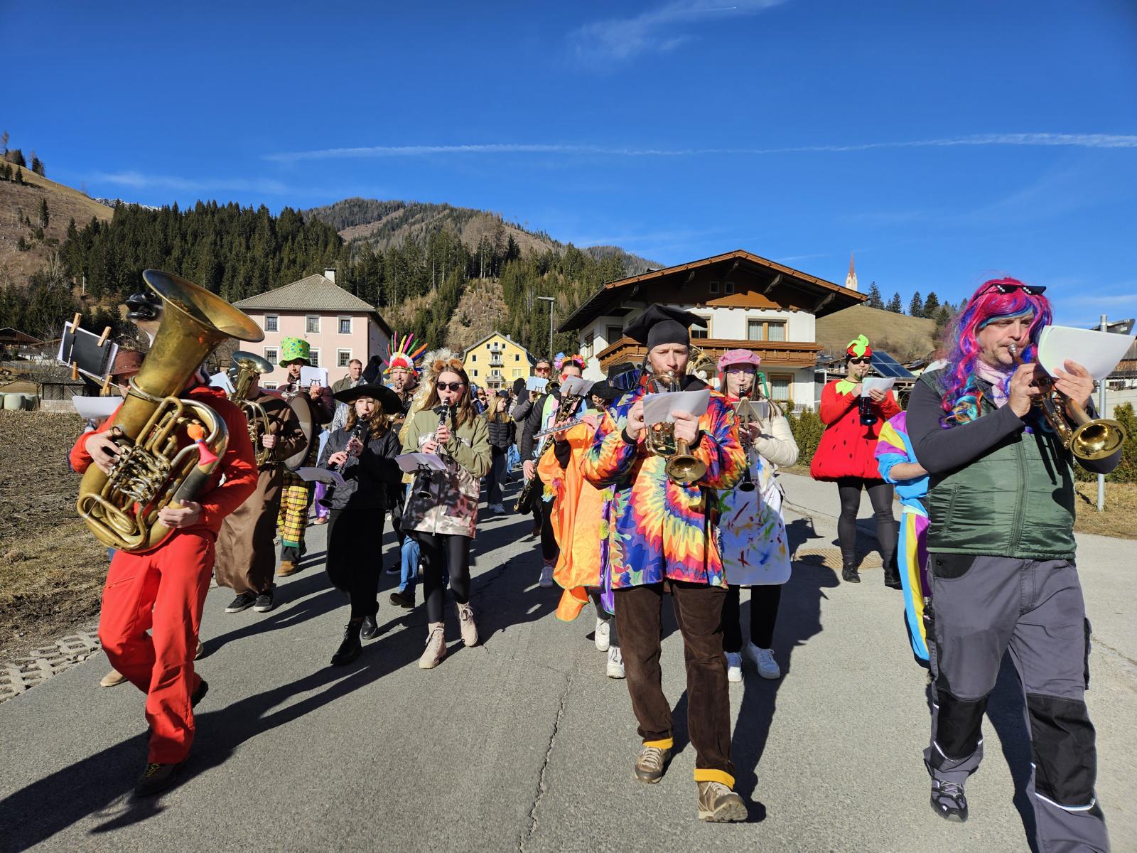 Bei Kaiserwetter versammelten sich am Faschingssonntag, 2. März 2025 pünktlich um 14.26 Uhr viele kleine und große Faschingsnarren vor dem Gemeindehaus, um bei der Dorfrunde für ein buntes Bild und ausgelassene Stimmung zu sorgen. Die originell verkleideten Musikanten und Musikantinnen der BMK Strassen, die den Umzug anführten, ließen sich auch durch überraschende Proteste der Klimakleber und den „genussvollen“ Auftritt von Erdbeeren nicht aus der Ruhe bringen.