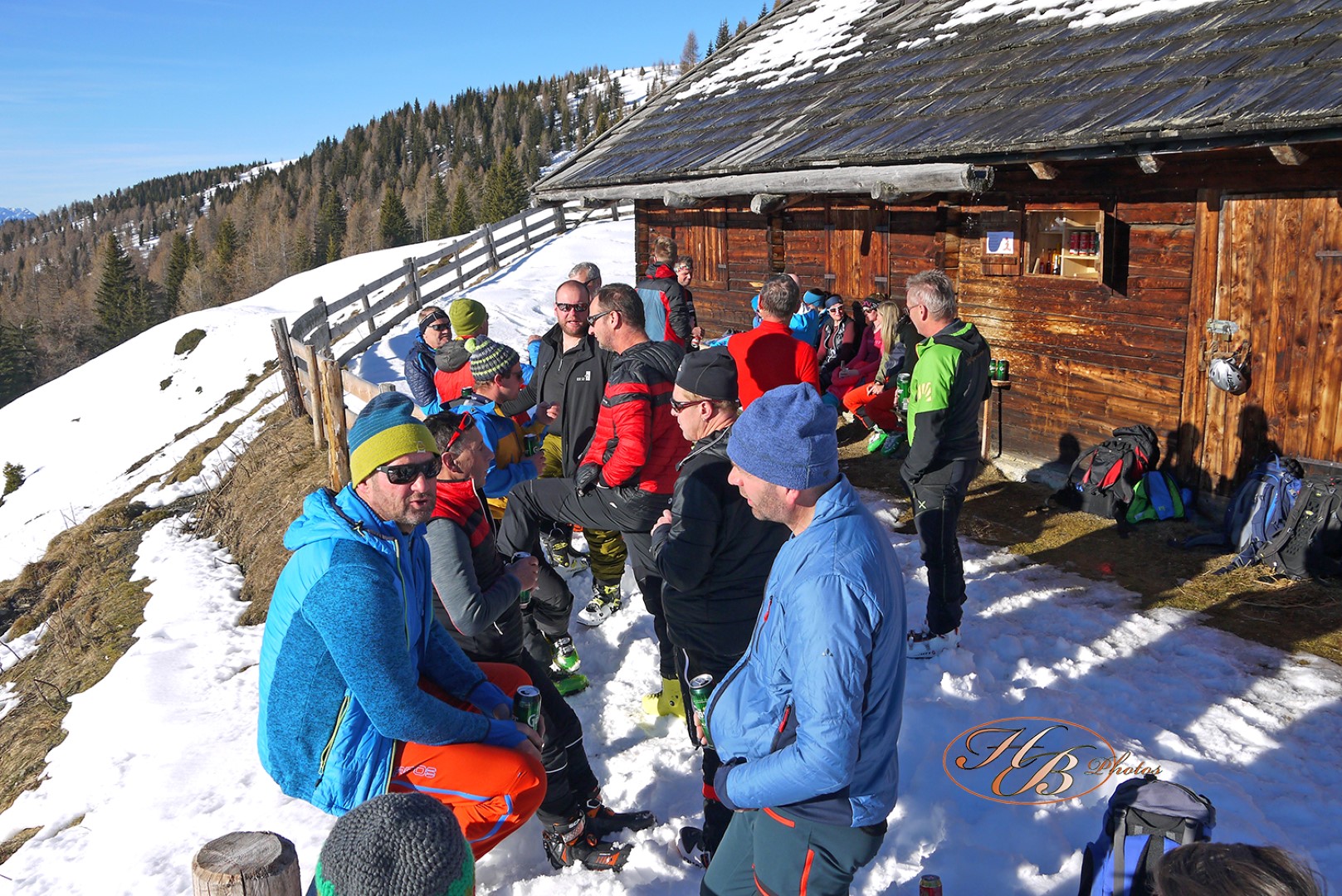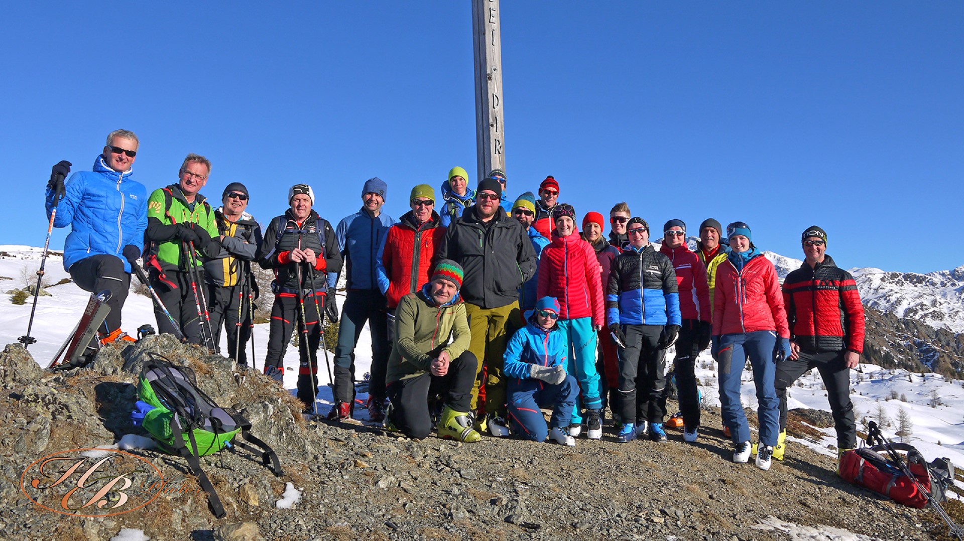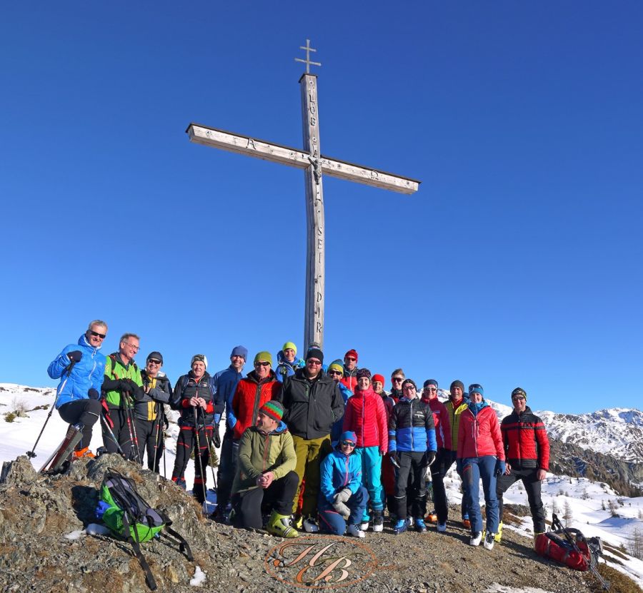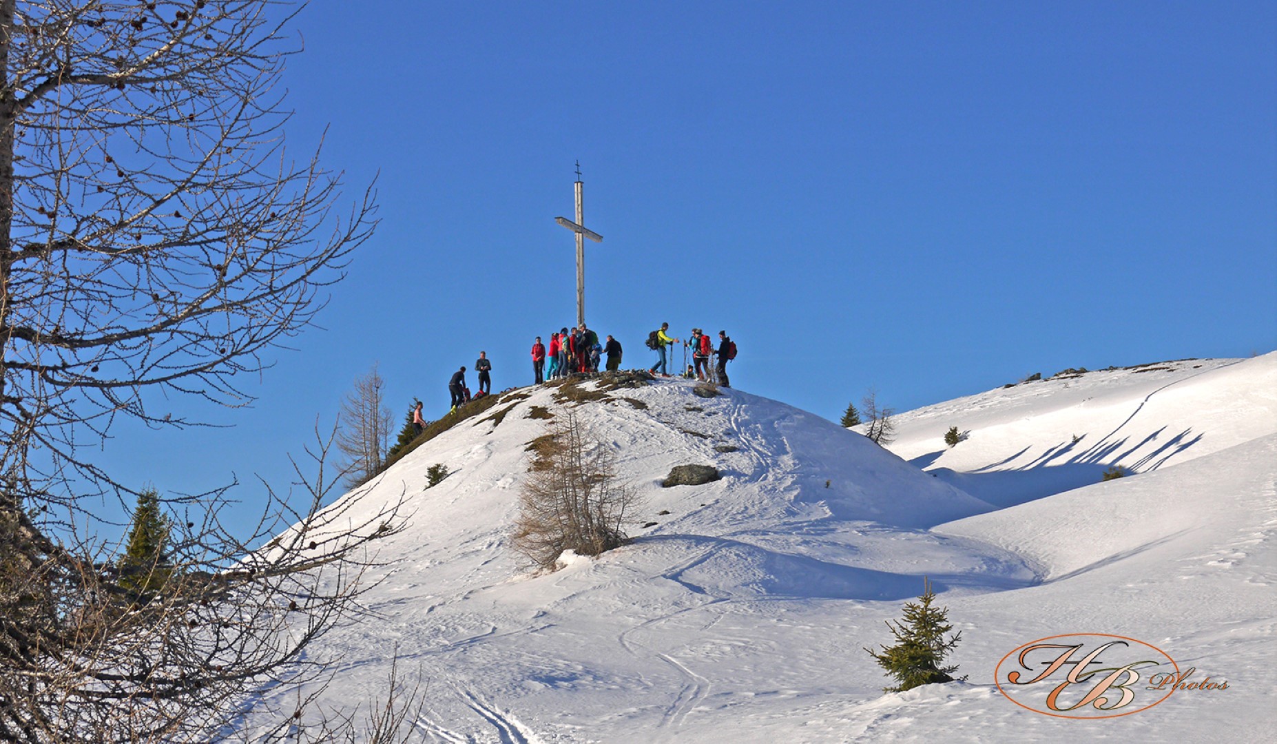 Sepp führte die Truppe im zügigem Schritt durch Wald und Weg. Die aufgehende Sonne zeigte sich bald mit ihren satten u. wärmenden Strahlen. Beim "Knappen" gab es dann eine kleine Verschnaufpause mit dem ersten "Zwischenzeit-Foto". Weiter über die Schispur in Richtung Alm und über den Gipfelhang zum Fronstadler Almkreuz. Dort angekommen, wurde jeder und jede vom Sepp mit "Berg Heil" begrüßt. Rasch wurde die Kleidung gewechselt und wer noch Zeit hatte, auch ein kleiner Bissen verzehrt, bevor Sepp mit einer kurzen Andacht und einem Gedenken an Siegfried und an alle-in diesem Jahr Verstorbenen-an die Teilnehmer richtete. Im Anschluss gab es dann auch das Gipfelbild und das inzwischen berühmte "Schatten-Gipfelbild" bevor man den Gipfelbereich verließ und sich unten bei der Almhütte zum "gemütlichen Teil" wieder traf. Dort gab es dann von der "Almbar"einige gute Getränke zur freien Entnahme. Nach einem gemütlichen Plausch und angeregten Gesprächen über "Gott und die Welt" - aber ohne Pandemie-Themen, wurde dann "Zeitig" die "Talfahrt" unternommen. Zuvor wünschten sich alle noch einen "guten Rutsch" ins neue Jahr und "Alles Gute für 2022"!