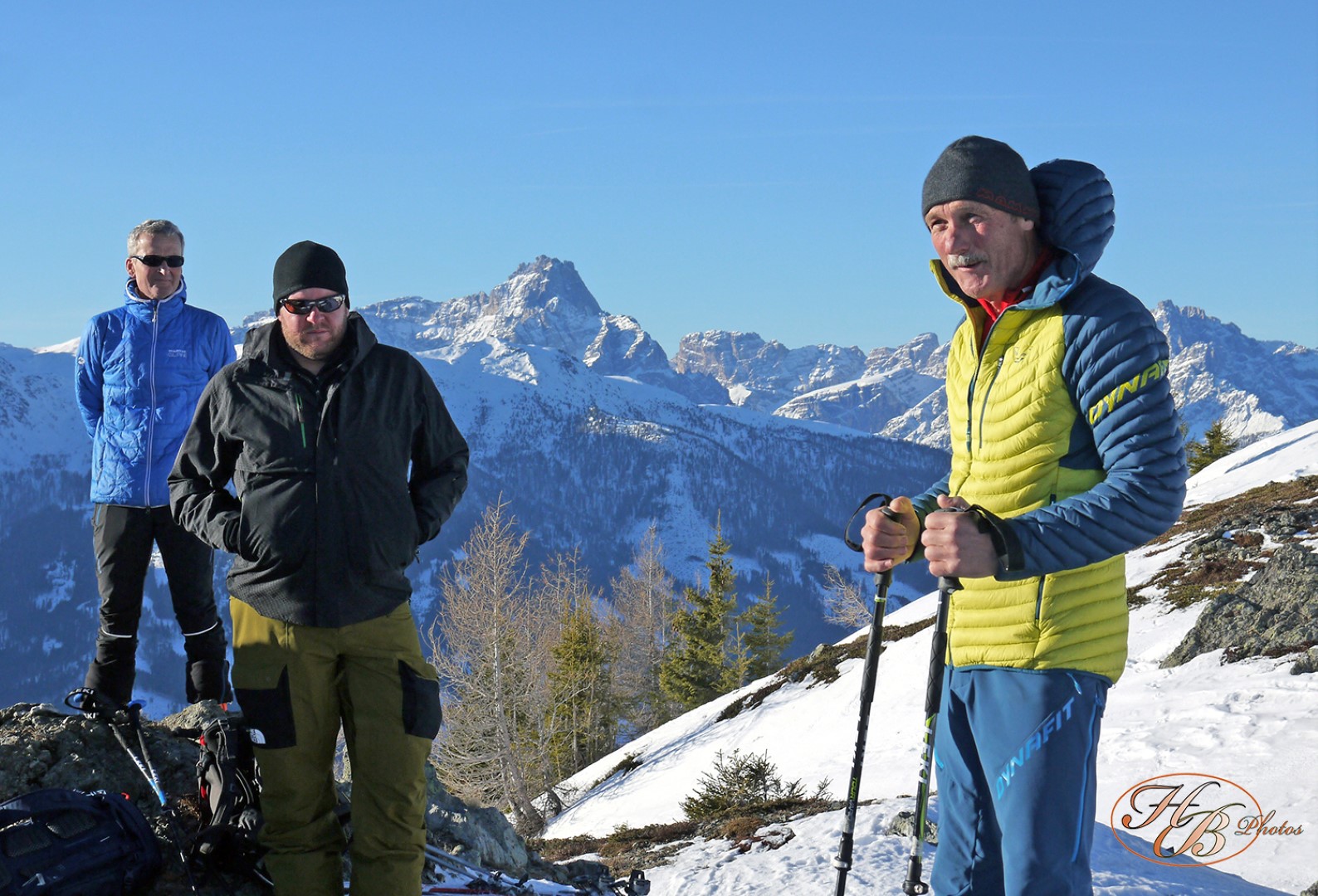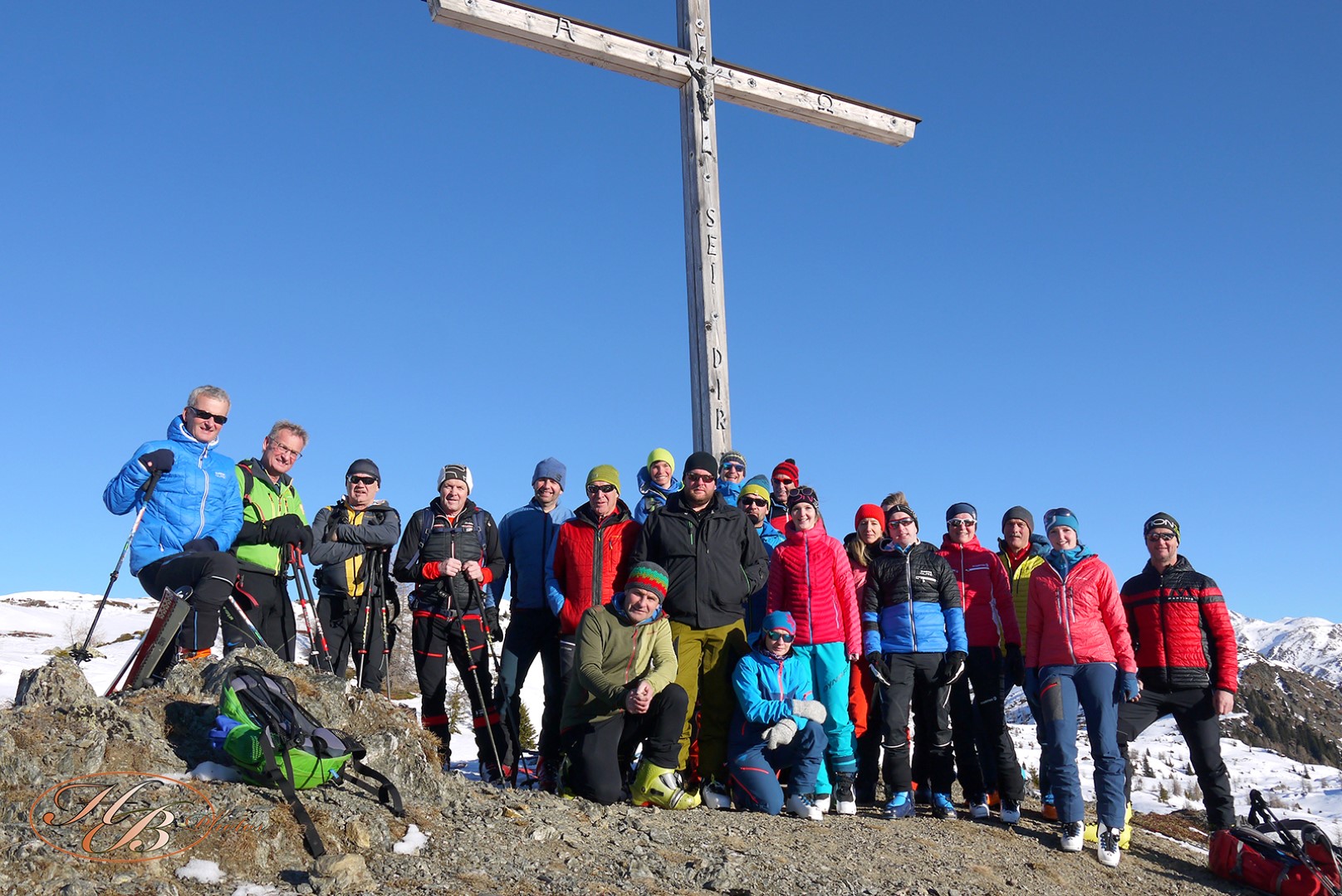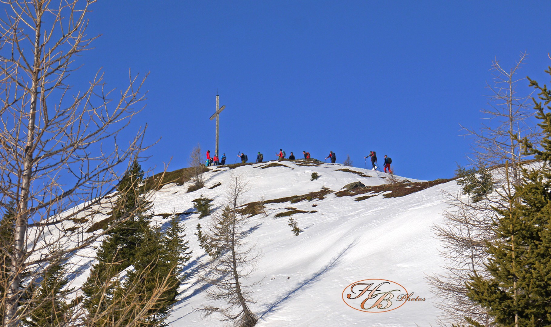 Sepp führte die Truppe im zügigem Schritt durch Wald und Weg. Die aufgehende Sonne zeigte sich bald mit ihren satten u. wärmenden Strahlen. Beim "Knappen" gab es dann eine kleine Verschnaufpause mit dem ersten "Zwischenzeit-Foto". Weiter über die Schispur in Richtung Alm und über den Gipfelhang zum Fronstadler Almkreuz. Dort angekommen, wurde jeder und jede vom Sepp mit "Berg Heil" begrüßt. Rasch wurde die Kleidung gewechselt und wer noch Zeit hatte, auch ein kleiner Bissen verzehrt, bevor Sepp mit einer kurzen Andacht und einem Gedenken an Siegfried und an alle-in diesem Jahr Verstorbenen-an die Teilnehmer richtete. Im Anschluss gab es dann auch das Gipfelbild und das inzwischen berühmte "Schatten-Gipfelbild" bevor man den Gipfelbereich verließ und sich unten bei der Almhütte zum "gemütlichen Teil" wieder traf. Dort gab es dann von der "Almbar"einige gute Getränke zur freien Entnahme. Nach einem gemütlichen Plausch und angeregten Gesprächen über "Gott und die Welt" - aber ohne Pandemie-Themen, wurde dann "Zeitig" die "Talfahrt" unternommen. Zuvor wünschten sich alle noch einen "guten Rutsch" ins neue Jahr und "Alles Gute für 2022"!