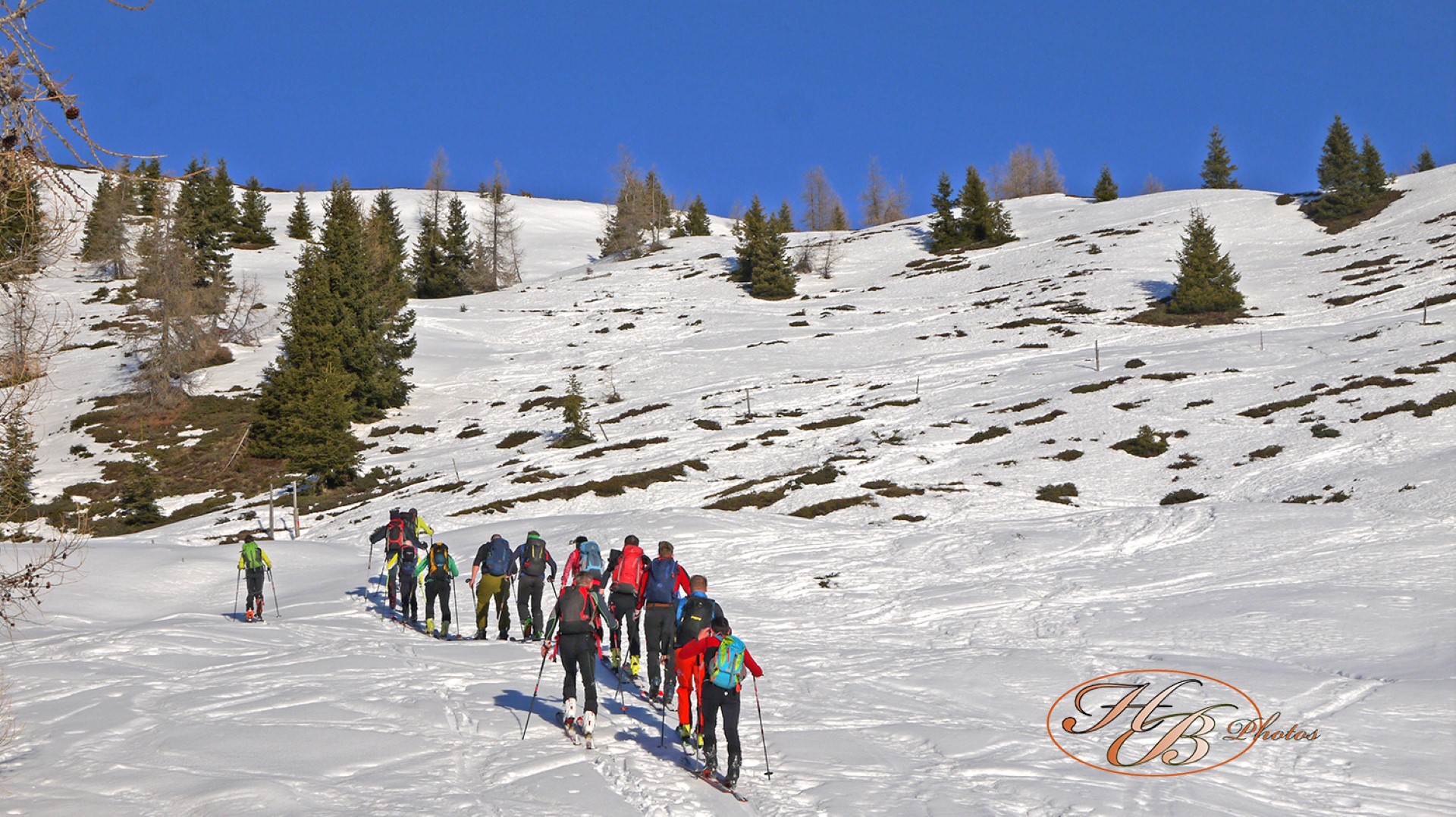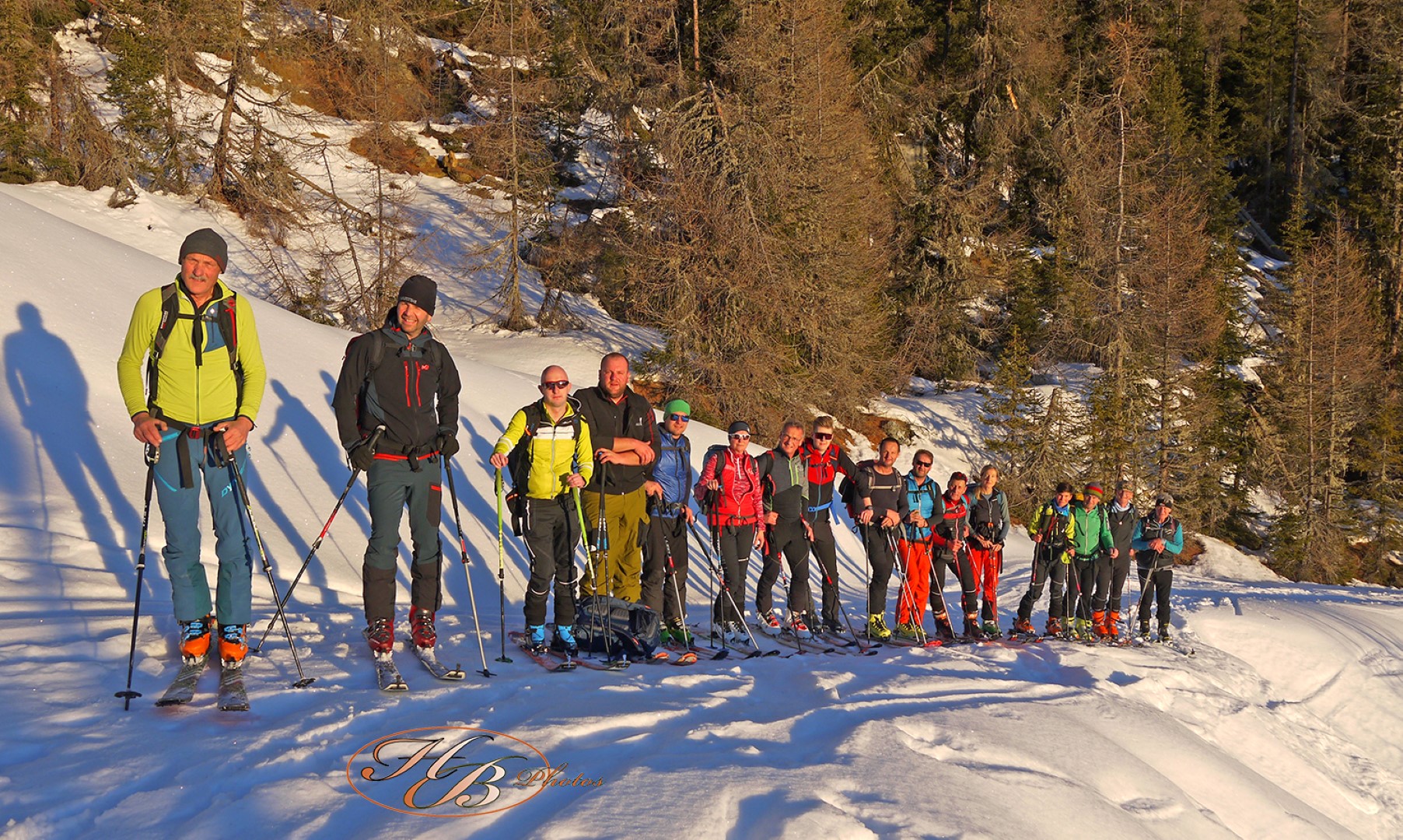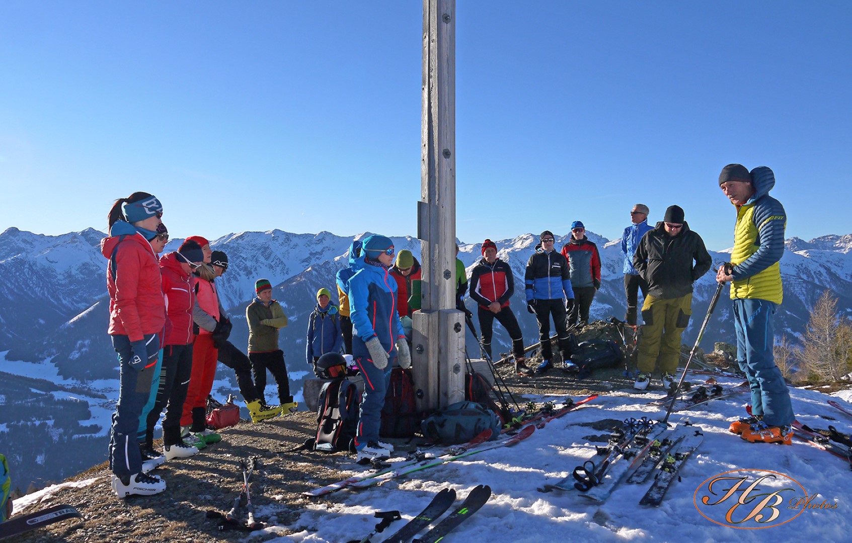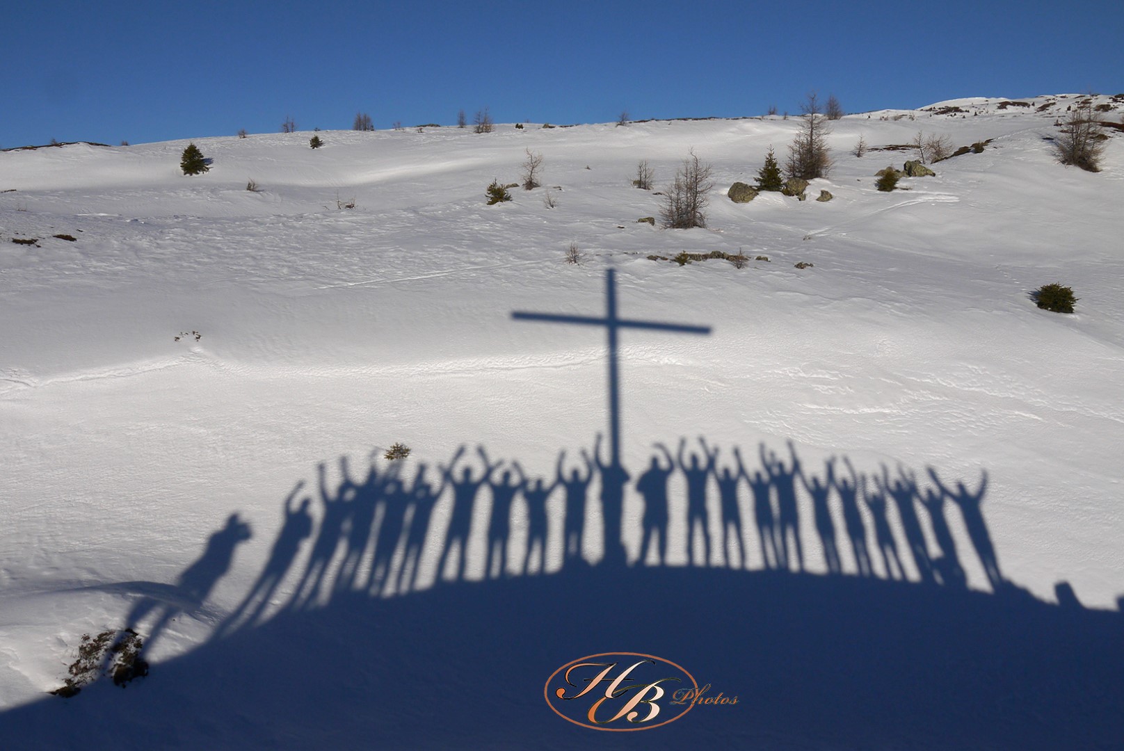 Sepp führte die Truppe im zügigem Schritt durch Wald und Weg. Die aufgehende Sonne zeigte sich bald mit ihren satten u. wärmenden Strahlen. Beim "Knappen" gab es dann eine kleine Verschnaufpause mit dem ersten "Zwischenzeit-Foto". Weiter über die Schispur in Richtung Alm und über den Gipfelhang zum Fronstadler Almkreuz. Dort angekommen, wurde jeder und jede vom Sepp mit "Berg Heil" begrüßt. Rasch wurde die Kleidung gewechselt und wer noch Zeit hatte, auch ein kleiner Bissen verzehrt, bevor Sepp mit einer kurzen Andacht und einem Gedenken an Siegfried und an alle-in diesem Jahr Verstorbenen-an die Teilnehmer richtete. Im Anschluss gab es dann auch das Gipfelbild und das inzwischen berühmte "Schatten-Gipfelbild" bevor man den Gipfelbereich verließ und sich unten bei der Almhütte zum "gemütlichen Teil" wieder traf. Dort gab es dann von der "Almbar"einige gute Getränke zur freien Entnahme. Nach einem gemütlichen Plausch und angeregten Gesprächen über "Gott und die Welt" - aber ohne Pandemie-Themen, wurde dann "Zeitig" die "Talfahrt" unternommen. Zuvor wünschten sich alle noch einen "guten Rutsch" ins neue Jahr und "Alles Gute für 2022"!