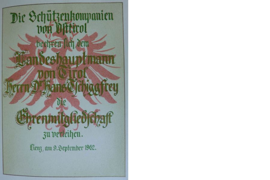 In der Verleihungsurkundenmappe haben alle Osttiroler Schützenkompanien vom bekannten Maler Franz Wimmer ein Aquarell vom jeweiligen Ort anfertigen lassen. Dieses Bild wurde vom damaligen Schützenhauptmann, Altbürgermeister und Ehrenbürger, Josef Mayr - Staffiner, sowie vom damaligen Obmann der Schützenkompanie, Johann Tassenbacher - Schuster in Hof - unterzeichnet.