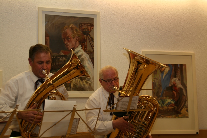 Künste im Wettstreit: Bläserweisen erfüllten den Ausstellungssaal. (li:Hermann Ritsch und Robert Aichner) Fotos: Karl Schett